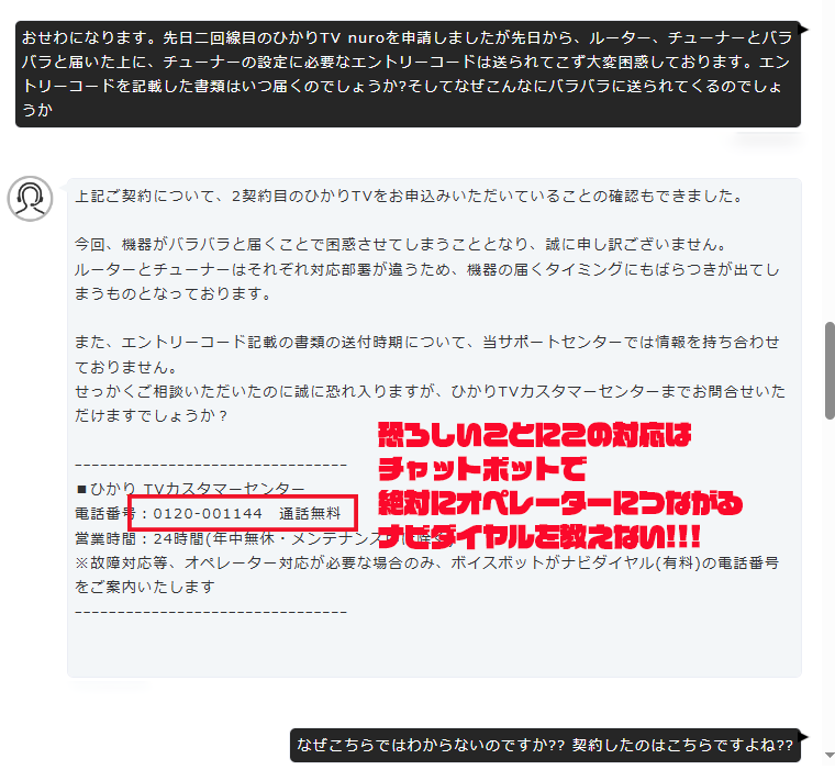 オペレーターは「NUROで承っているのはオプションの受付や解約のみ」であり、機器発送やエントリーコード送付はNTTドコモ(ひかりTV提供元)側の対応だと説明しています。