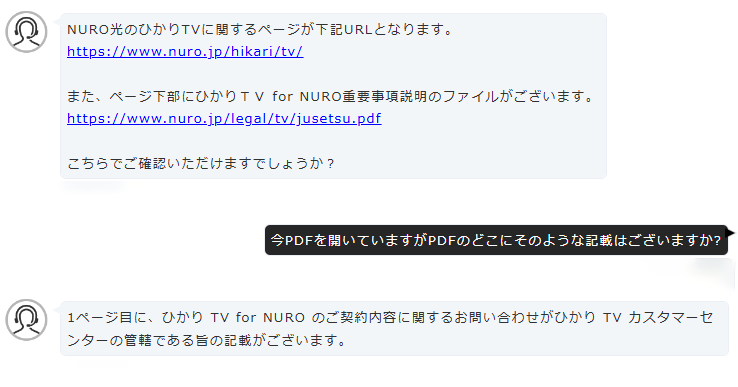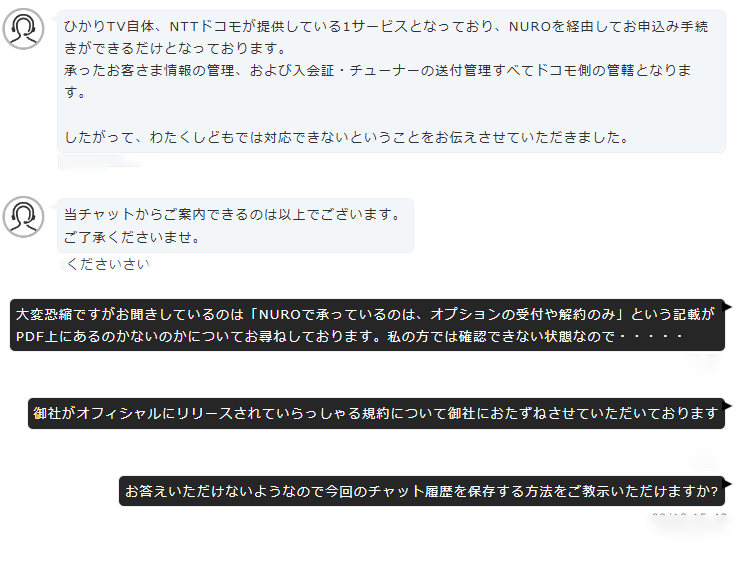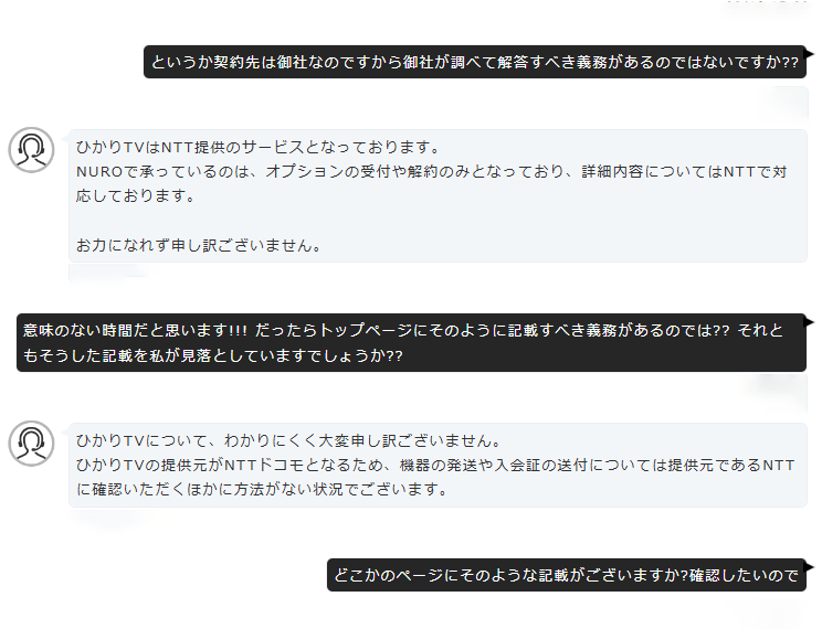 と返してきたので、こちら側がその「NUROが行うのはオプションの受付や解約のみ」という規定がどこに記載されているのかを訊ねた後に